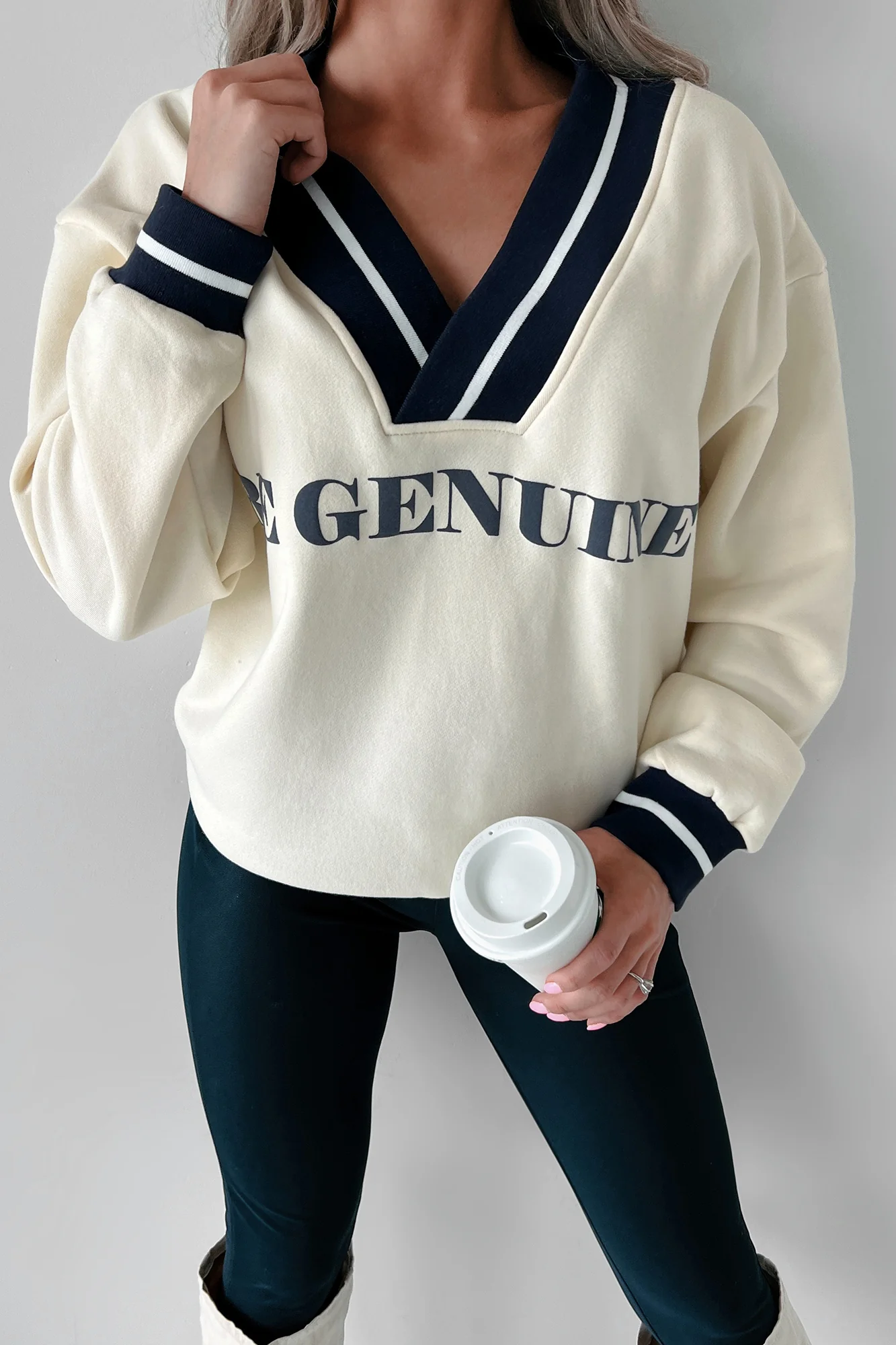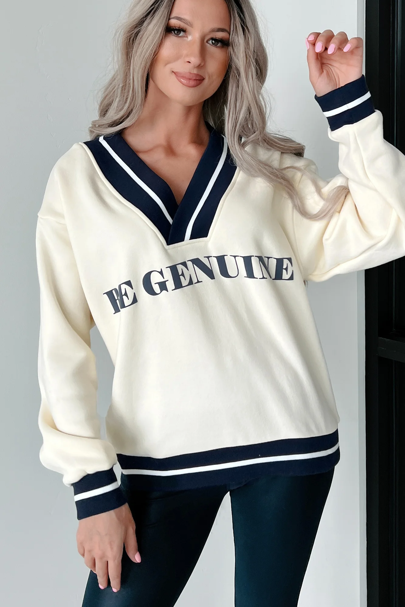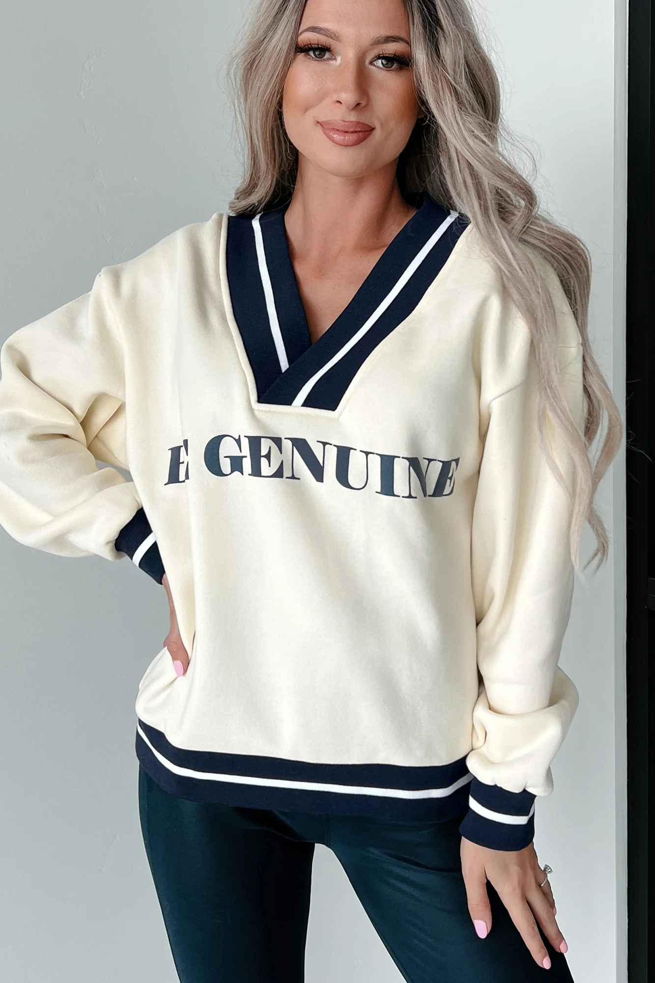 "Be Genuine" Varsity Stripe Graphic Sweater (Cream)
